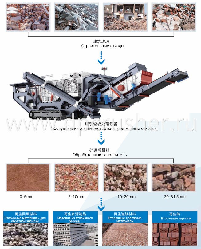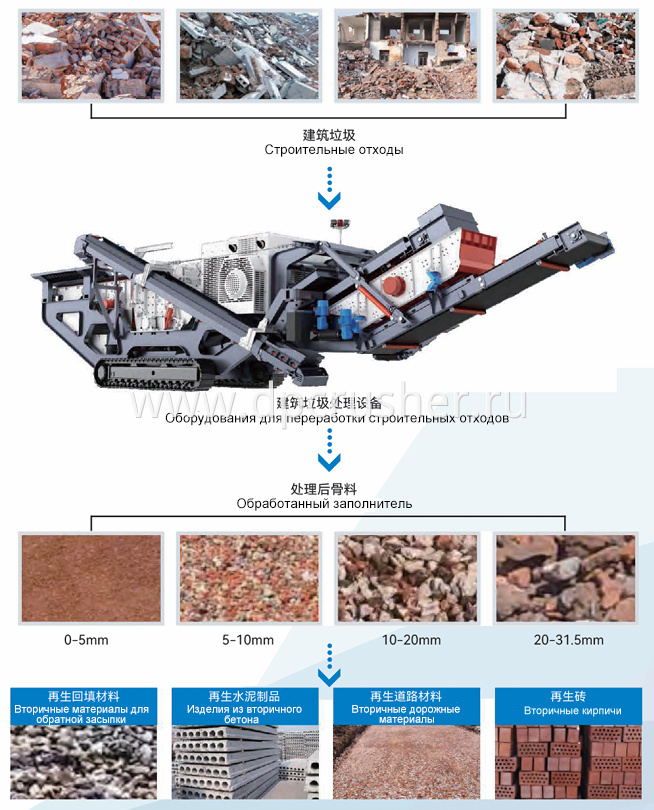 Мобильные дробильно-сортировочные комплексы для переработки строительных отходов используют многоступенчатую компоновку, объединяя щековую дробилку, роторную дробилку, конусную дробилку, вибрационный грохот и конвейерные ленты. Мобильные установки представлены в двух вариантах ходовой части: гусеничном и колесном, что позволяет выбирать оптимальный вариант в зависимости от состояния дорожного покрытия на рабочей площадке.